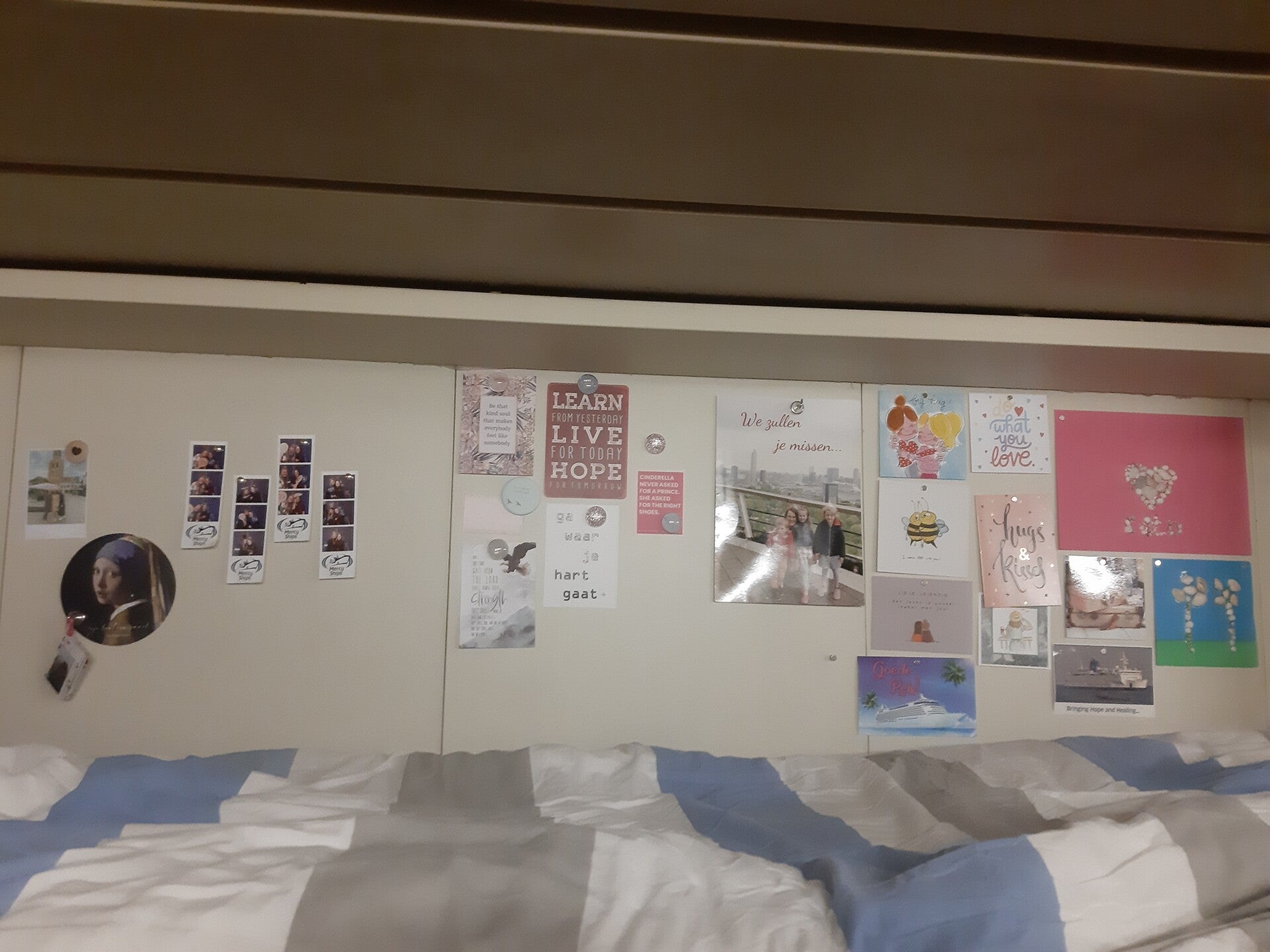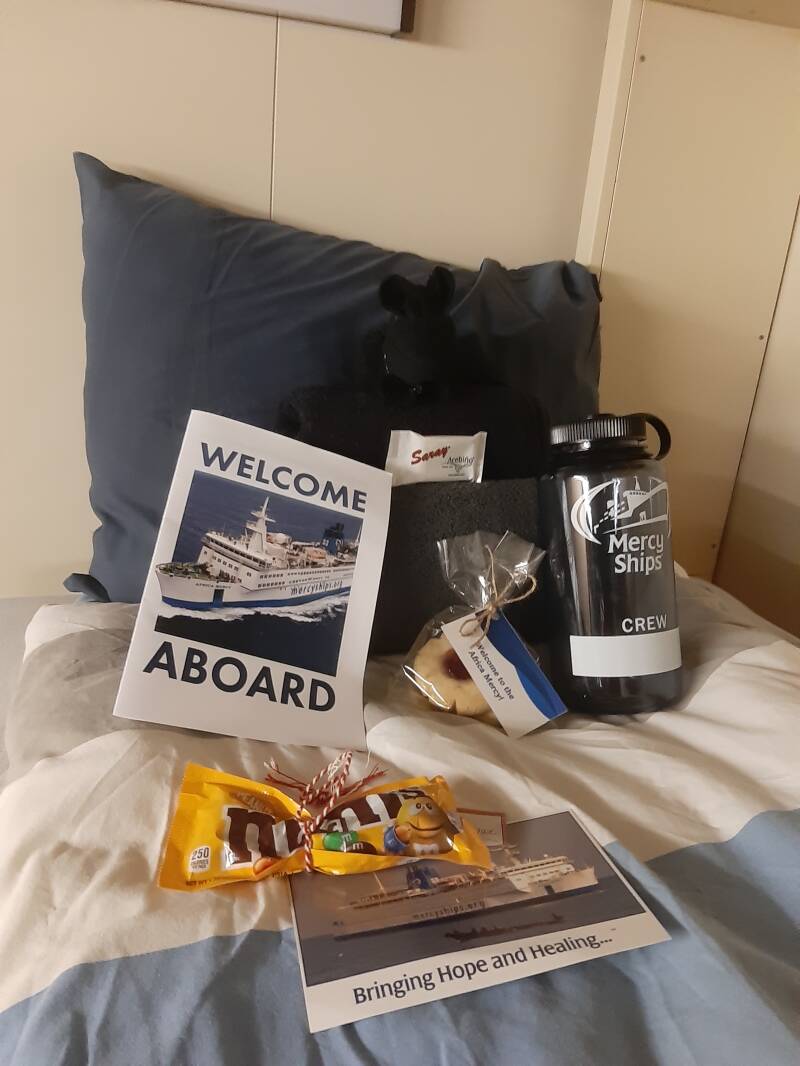De volgende ochtend gelukkig negatief getest, en na een ontbijtje op het dakterras met uitzicht op de Global Mercy word ik, samen met nog een paar nieuwkomers, opgehaald door een Mercy Ships busje. Onderweg worden we welkom geheten in het Engels, gevolgd met een "wie van jullie is hier Nederlands?", onze chauffeur blijkt een mede Nederlander te zijn. We rijden de haven binnen, en na het zien van de Mercy Ships auto zwaait ook het hek wat het schip afsluit van de rest van de haven zo open. Daar sta ik dan, 1,5 jaar aan voorbereiding en nu sta ik hier naast het schip, heel onwerkelijk, heel bijzonder, heel dankbaar!! Bij de receptie worden wat papieren uitgedeeld en een batch gemaakt, en ook daar klinkt na het zien van mijn Nederlandse paspoort een "goedemorgen, welkom aan boord". Toch handig, al die Nederlanders ;-) Geen tijd om stil te zitten, want er volgt gelijk een hele hoop informatie en een rondleiding over het schip. Ik zit net met de nieuwkomers groep in het café of Erica komt aangelopen en geeft me een knuffel. Heel de vliegreis heb ik me redelijk goed kunnen houden, maar nu ik in een onbekende omgeving, na een hele hoop indrukken in korte tijd, weer een bekende zie komen er toch wat tranen. Zo fijn om iemand te hebben die al precies weet hoe dat begin gaat aan boord, en die weet hoe je je voelt!
