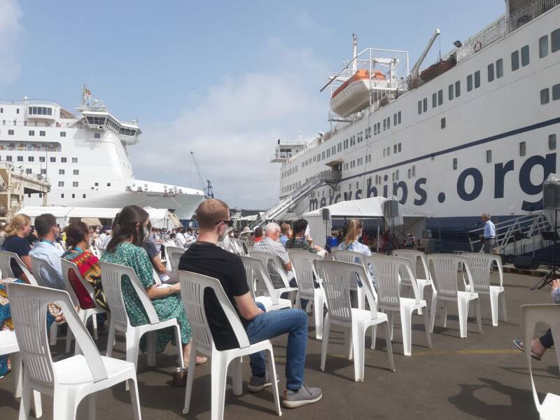 Afgelopen vrijdag hebben we de Global Mercy weer uitgezwaaid. Ze heeft hier een maand gelegen voor allerlei celebrations, en er is aan boord in die tijd ook veel Medical Capacity Building gedaan, dat zijn trainingen voor lokale gezondheidswerkers. Het was heel bijzonder om mee te maken dat allebei de schepen voor het eerst naarst elkaar in Afrika lagen, en om de mensen van de GLM te ontmoeten en leren kennen! We maakten ook voor het eerst een foto met bijna alle crew van beide schepen, een leuk zoekplaatje voor jullie om mij te vinden! Nu de GLM niet meer naast ons ligt en ik door het raam van de diningroom kijk voelt het wel een beetje als lege nest syndroom ;-) Maar als het goed is staan de mensen van de GLM ons in december al zwaaiend op te wachten in Tenerife!